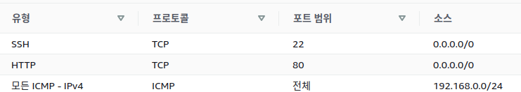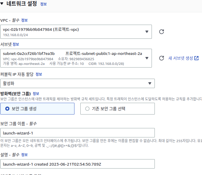 퍼블릭 ip로 접속을 위해 보안그룹 생성해줘야됨(ssh, http허용)