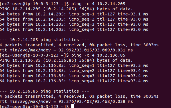 각 리전의 프라이빗인스턴스로 핑이 보내지는지 확인