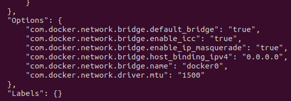 마지막 Options 섹션에 bridge 너트워크의 옵션들이 나열되어 있는데 그중 연결되어 있는 브릿지는 docker라고 나와있다.