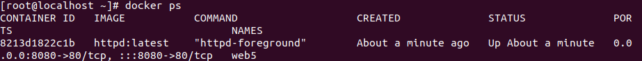 포트포워딩이 설정되면 docker ps 명령의 PORTS 필드 값이 이전과 다른 것을 알 수 있다.