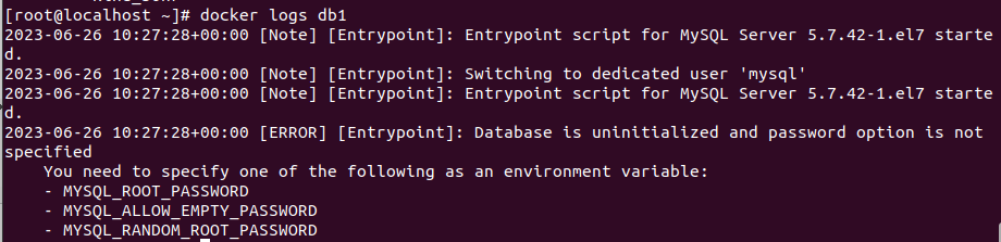 docker run -d --name db1 mysql:5.7 >> mysql:5.7 이미지로 db1 컨테이너를 실행한 뒤 로그를 확인한다.