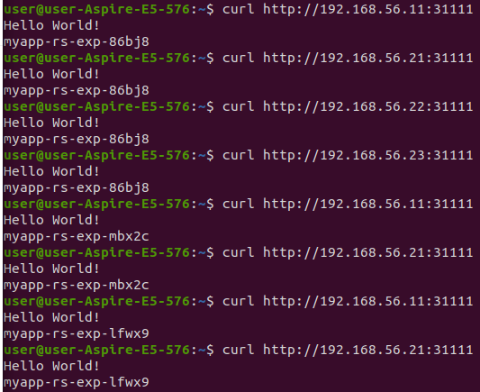 파드를 실행 후 bash쉘이 실행되며 curl 명령으로 서비스에 할당된 ip로 접근하면 각 파드에 부하 분산이 되는 것을 확인할 수 있다.