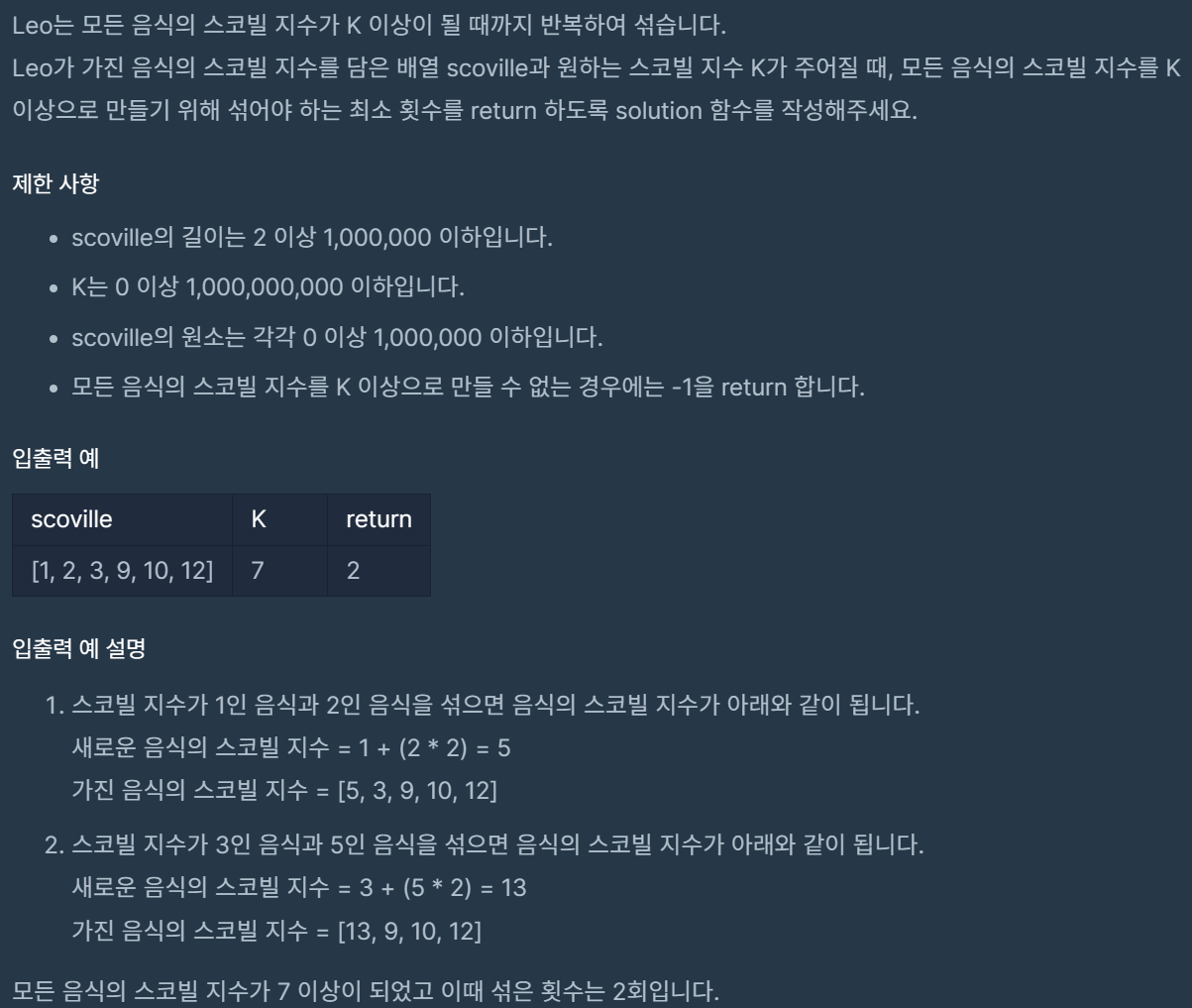 코딩테스트 연습 - 더 맵게 | 프로그래머스 스쿨 (programmers.co.kr)