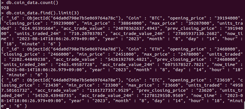 db.coin_data.find() >>> coin_data 컬렉션 모든 데이터 확인하는 코드