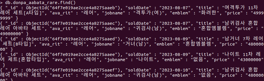 몽고db에서 저장되었는지 확인 ㄱㄱ >>> db.donpa_aabata_rare.find()
