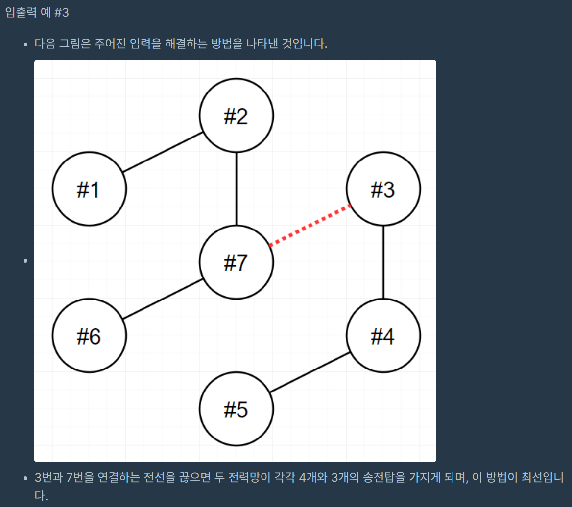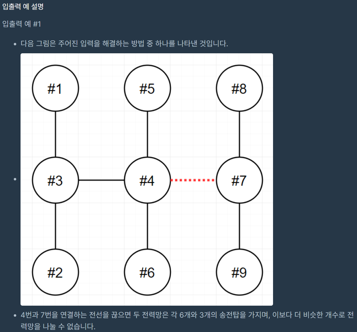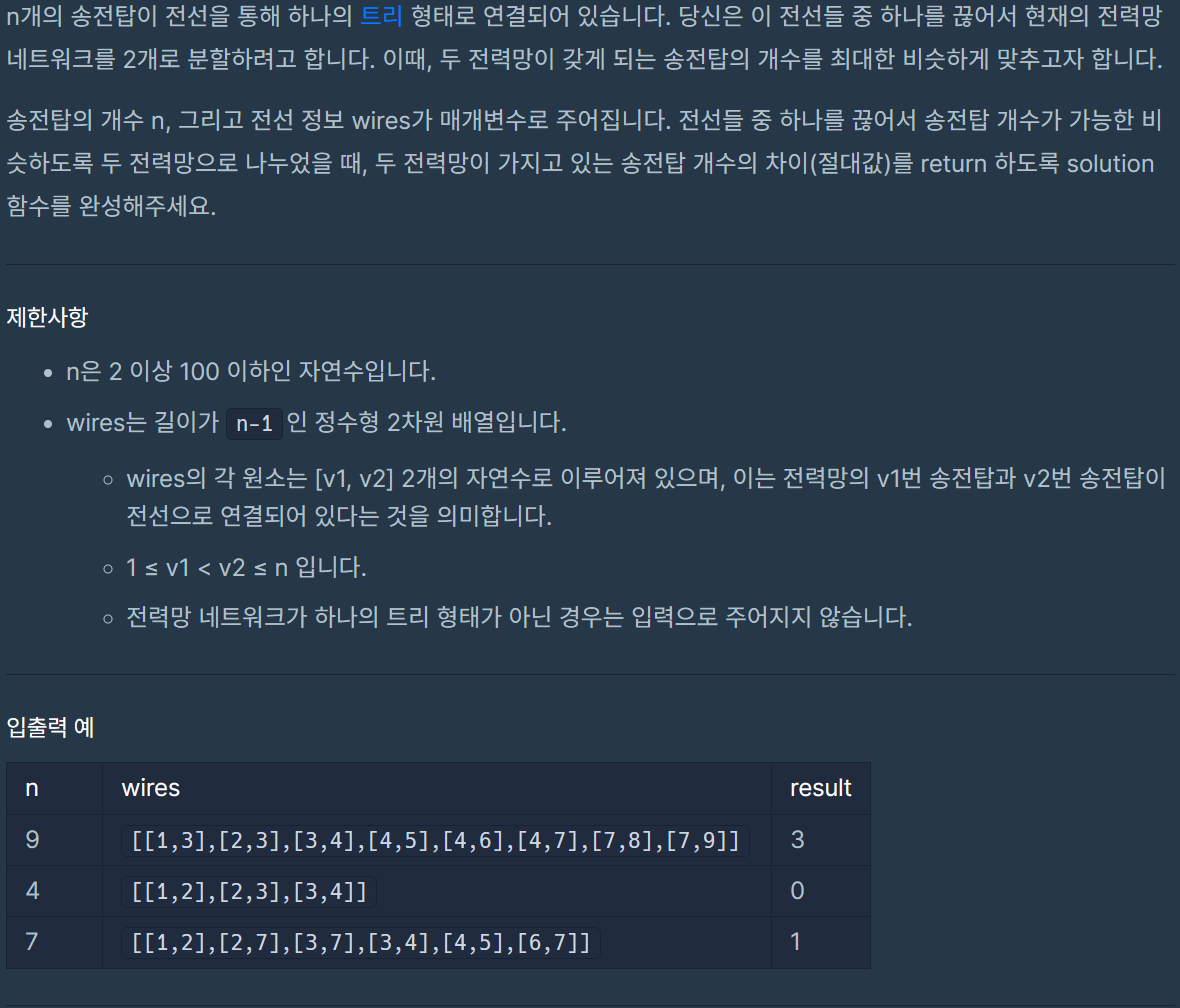 코딩테스트 연습 - 전력망을 둘로 나누기 | 프로그래머스 스쿨 (programmers.co.kr)