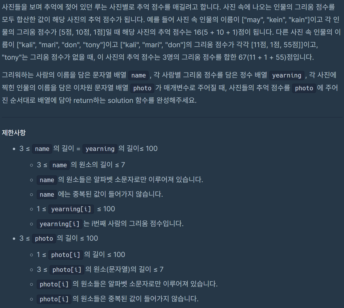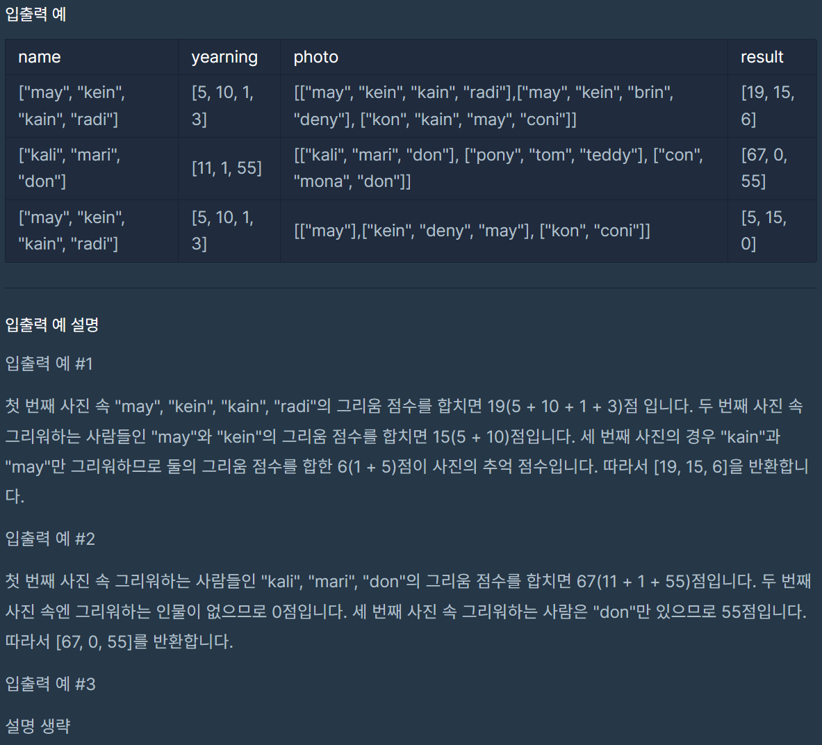 코딩테스트 연습 - 추억 점수 | 프로그래머스 스쿨 (programmers.co.kr)