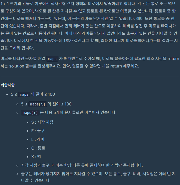 코딩테스트 연습 - 미로 탈출 | 프로그래머스 스쿨 (programmers.co.kr)
