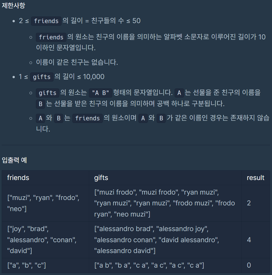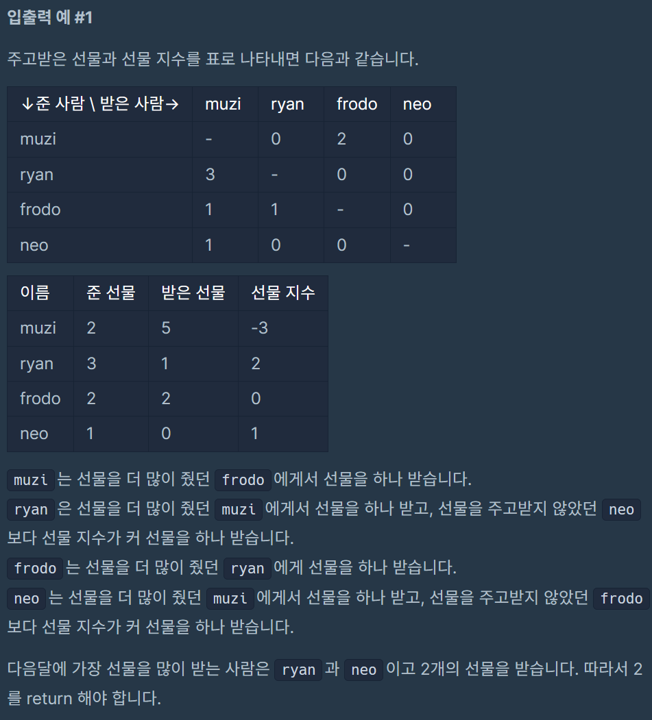 코딩테스트 연습 - 가장 많이 받은 선물 | 프로그래머스 스쿨 (programmers.co.kr)