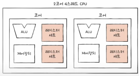 - 코어 = 명령어를 실제 실행하는 부품 ( ALU + 제어장치 + 레지스터 )