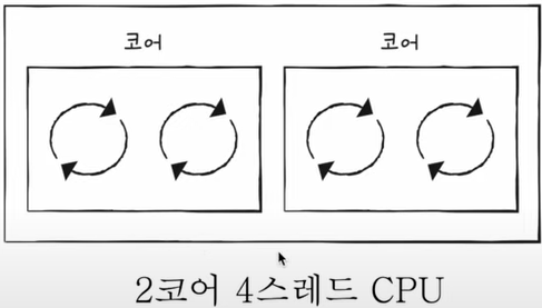 - 위 그림에선 각각의 코어가 2개의 스레드를 실행할 수 있다 → 각 코어가 두 개의 작업 흐름을 동시에 처리 가능하다는 뜻