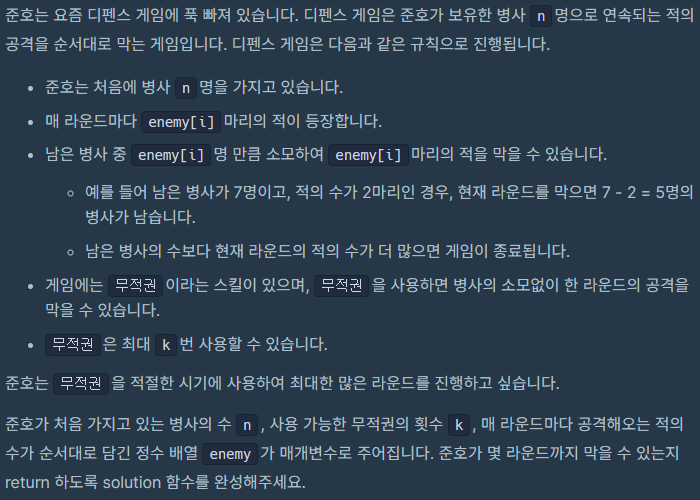 코딩테스트 연습 - 디펜스 게임 | 프로그래머스 스쿨 (programmers.co.kr)