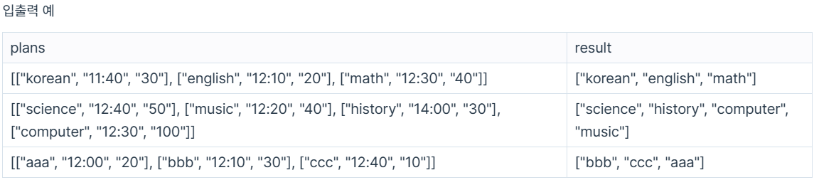과제 계획을 담은 이차원 문자열 배열 plans가 매개변수로 주어질 때, 과제를 끝낸 순서대로 이름을 배열에 담아 return 하는 solution 함수를 완성해주세요.