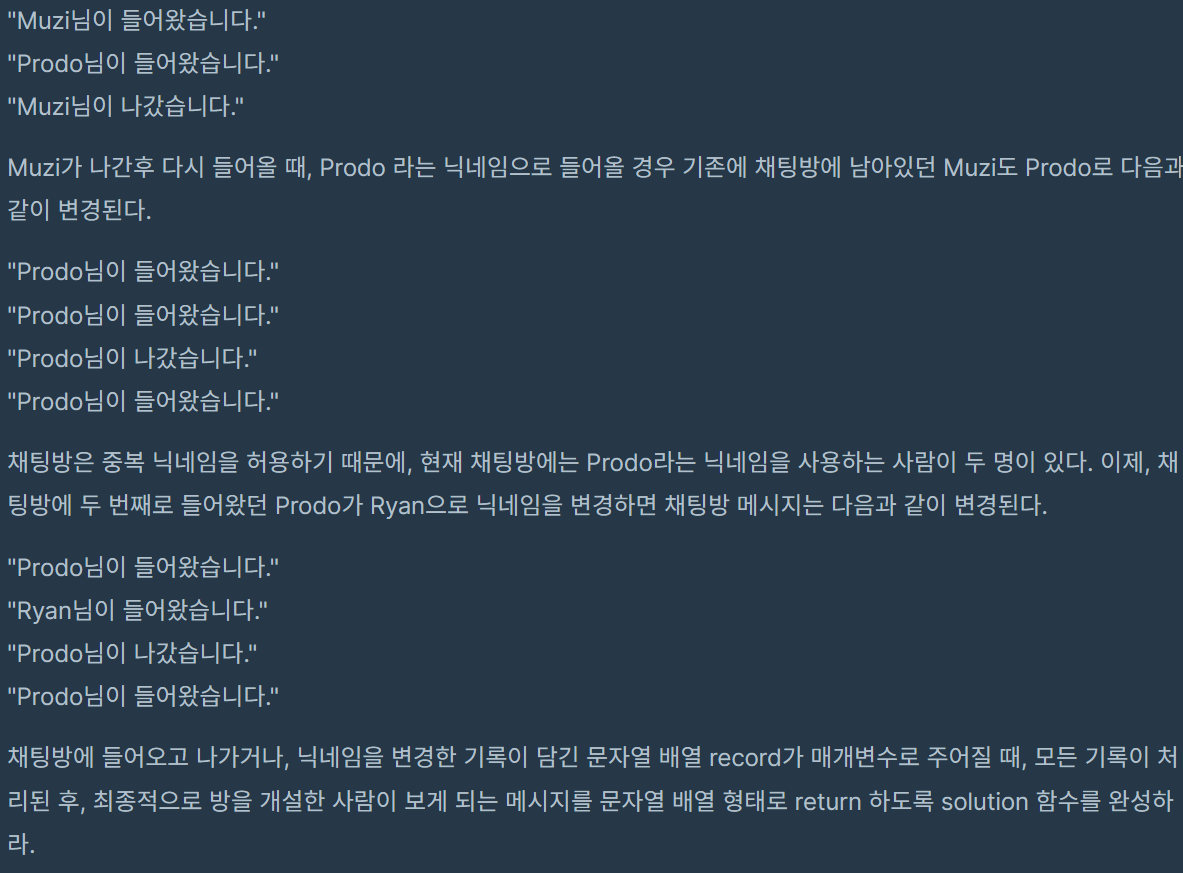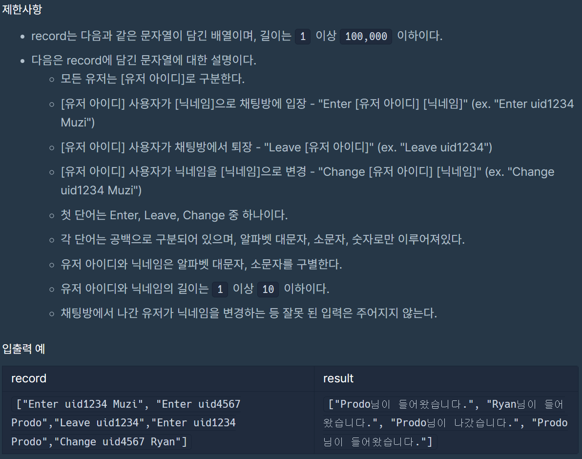 코딩테스트 연습 - 오픈채팅방 | 프로그래머스 스쿨 (programmers.co.kr)