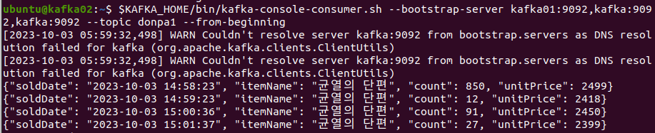 $KAFKA_HOME/bin/kafka-console-consumer.sh --bootstrap-server kafka01:9092,kafka:9092,kafka:9092 --topic donpa1 --from-beginning