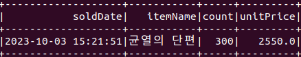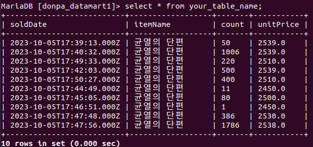 테스트로 테이블의 모든 데이터를 출력해보자 >>> select * from your_table_name;
