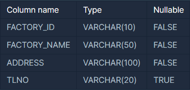 SELECT FACTORY_ID, FACTORY_NAME, ADDRESS # 컬럼 선택