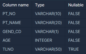 PATIENT 테이블 : 종합병원 등록된 환자정보