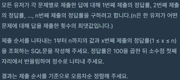 SELECT c.problem as NTH_SUBMISSION, round((sum(c.ck='ok')/count(*))*100,0) as CORRECT_RATE