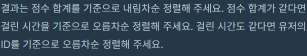 ORDER BY TOTAL_SCORE desc, TIME_TAKEN, user_id