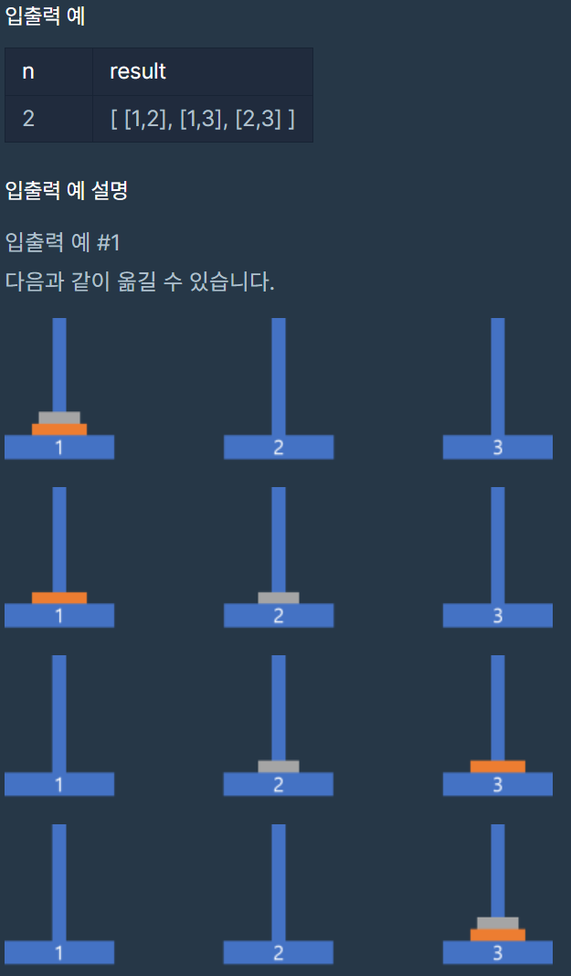 코딩테스트 연습 - 하노이의 탑 | 프로그래머스 스쿨 (programmers.co.kr)
