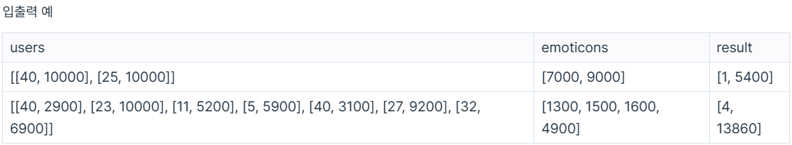 카카오톡 사용자 n명의 구매 기준을 담은 2차원 정수 배열 users, 이모티콘 m개의 정가를 담은 1차원 정수 배열 emoticons가 주어집니다. 이때, 행사 목적을 최대한으로 달성했을 때의 이모티콘 플러스 서비스 가입 수와 이모티콘 매출액을 1차원 정수 배열에 담아 return 하도록 solution 함수를 완성해주세요.