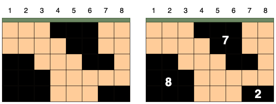 예를 들어 가로가 8, 세로가 5인 격자 모양의 땅 속에 위 그림처럼 석유가 발견되었다고 가정하겠습니다. 상, 하, 좌, 우로 연결된 석유는 하나의 덩어리이며, 석유 덩어리의 크기는 덩어리에 포함된 칸의 수입니다. 그림에서 석유 덩어리의 크기는 왼쪽부터 8, 7, 2입니다.