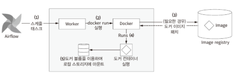 - DockerOperator은 적절한 인수를 사용해 워커 시스템에서 docker run 명령 실행