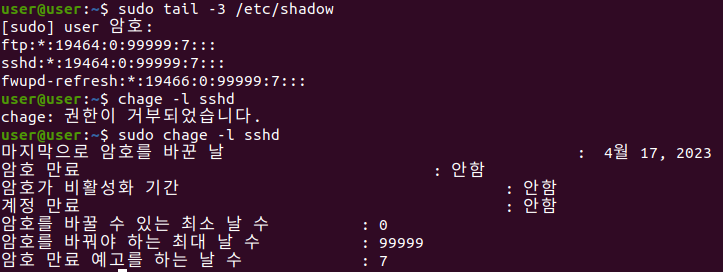 3.chage : 패스워드 만료 정보를 변경하는 명령어