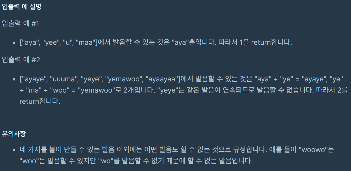 solution(["ayaye", "uuu", "yemayema", "yemawoo", "ayaayaa"])