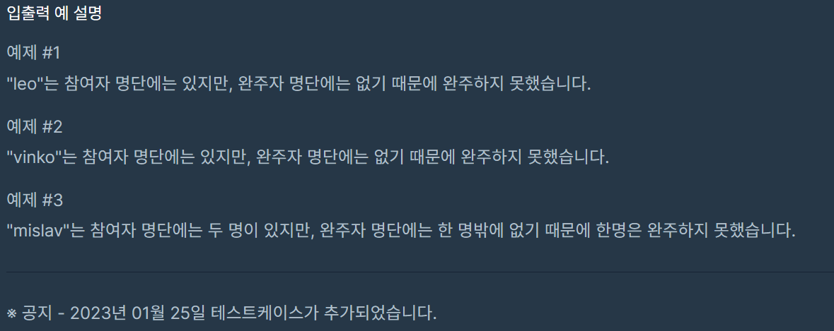 #결굴 남는 해시값이 완주하지 못한 1명